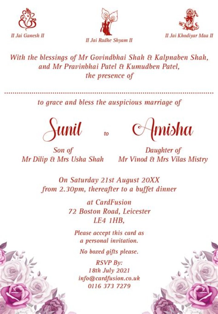 - Names and titles: The names of the bride and groom, as well as their parents, should be included in the invitation, along with any appropriate titles, such as "Shri" or "Smt."