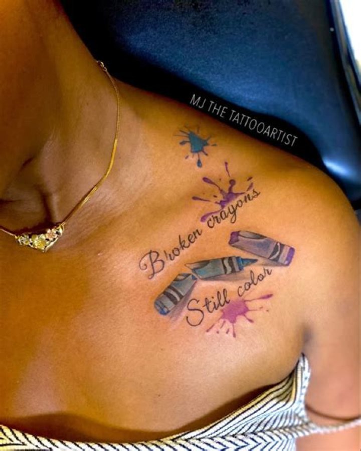 The "broken crayons still color" tattoo symbolizes the idea that even though something may be broken or damaged, it can still be beautiful and useful. This concept can be applied to many different areas of life, such as self-acceptance, overcoming adversity, and embracing flaws.