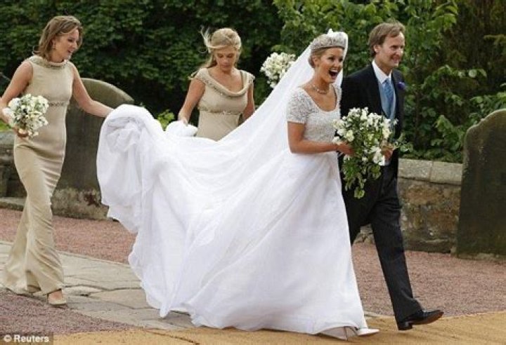 Chelsy Davy's wedding dress was a custom-made creation by designer Erdem Moralioglu. The dress was made of ivory silk crepe and featured a high neckline, long sleeves, and a full skirt. It was inspired by the style of Grace Kelly's wedding dress.