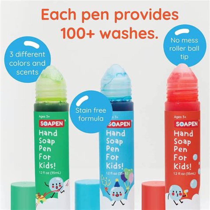 SoaPen is a kid-friendly hand soap designed to look like a pen. It comes in three different colors and allows kids to draw on their hands before washing.