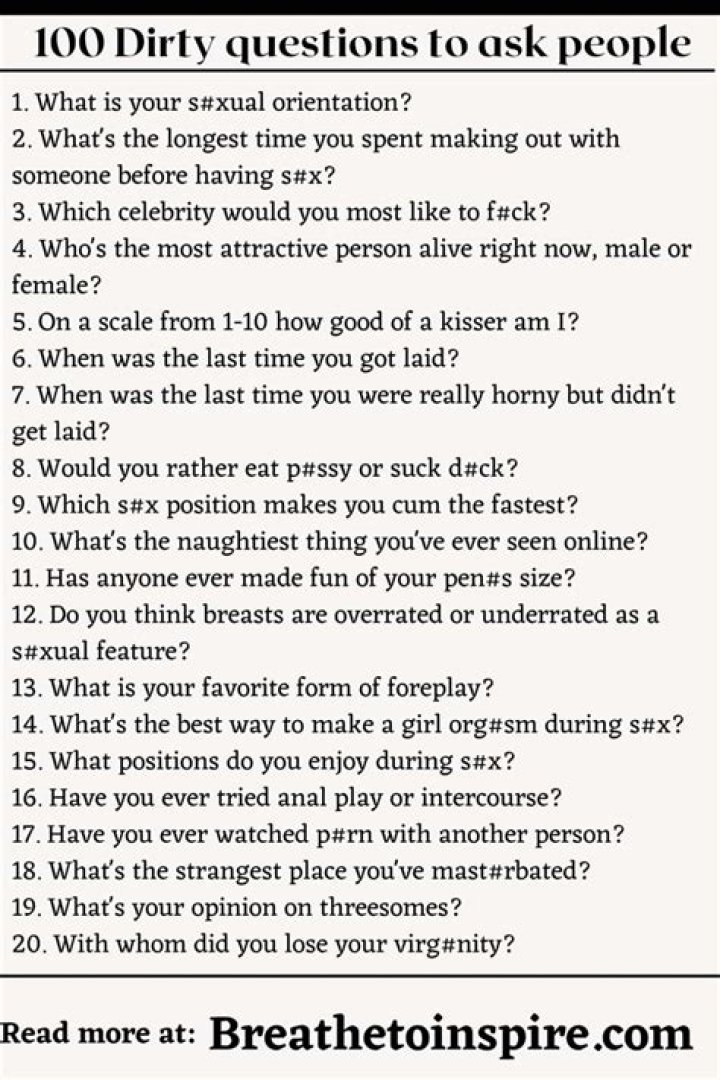 "100 Dirty Questions to Ask" is a list of sexually suggestive or explicit questions designed to promote intimacy and foster open communication between partners. These questions can range from playful and lighthearted to deeply personal and provocative.