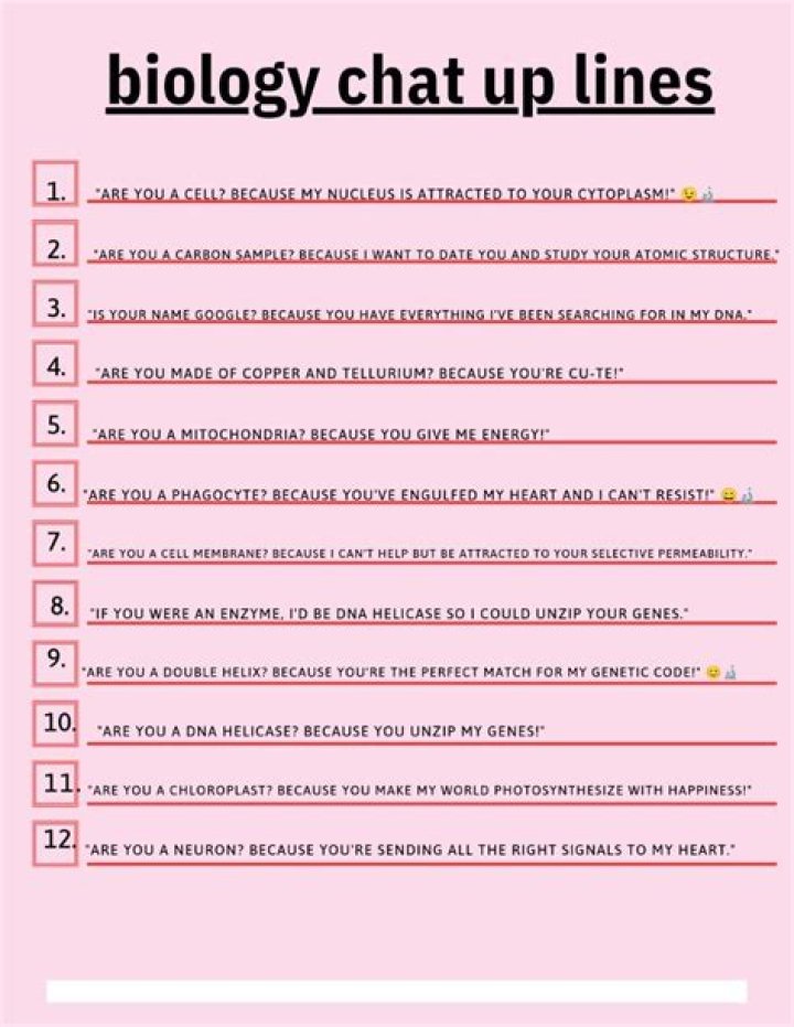 Biology chat up lines are a fun and unique way to show your interest in someone. They can be a great way to break the ice and start a conversation, and they can also be a lot of fun. However, there are a few things to keep in mind when using biology chat up lines.