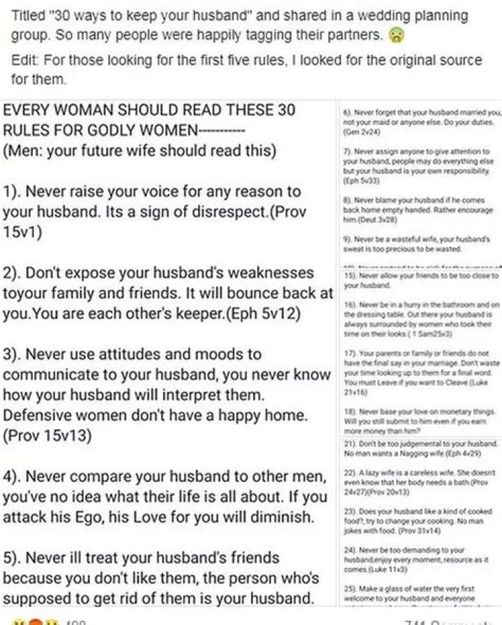 Strict husband rules for wife are often about power and control. Husbands who impose these rules want to feel powerful and in control of their wives. They may use these rules to restrict their wives' behavior, dress, and social interactions. This can give them a sense of power and control over their wives' lives.