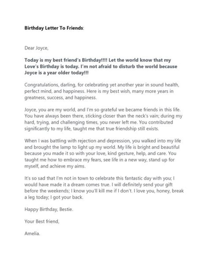 Question 3: What is the appropriate length for a letter to a best friend on her birthday?The length of the letter can vary depending on your writing style and the depth of your friendship. However, it is generally recommended to keep the letter concise and focused, while still conveying your heartfelt emotions and well wishes. Aim for a length that allows you to express your thoughts and feelings adequately without overwhelming your friend.