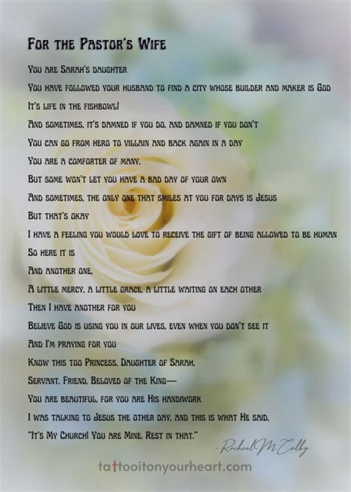 Words of encouragement for a pastor's wife are expressions of support and acknowledgment for the unique role and challenges she faces as the spouse of a spiritual leader. These words can range from simple gestures of appreciation to heartfelt affirmations of her worth and contributions.